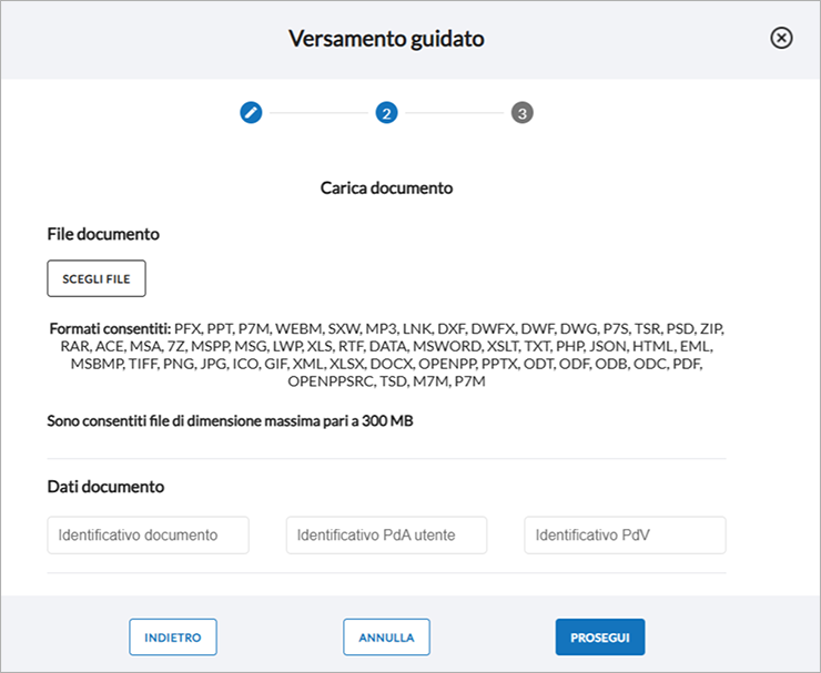 Sono consentiti file di dimensione massima pari a 300 MB. L'elenco dei formati dei documenti è presente in pagina.