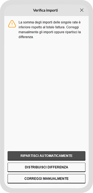 - Correggi manualmente: consente di tornare alla schermata Inserimento dati pagamento, dove puoi modificare direttamente gli importi delle rate o utilizzare i pulsanti Ripartisci automaticamente o Distribuisci la differenza.