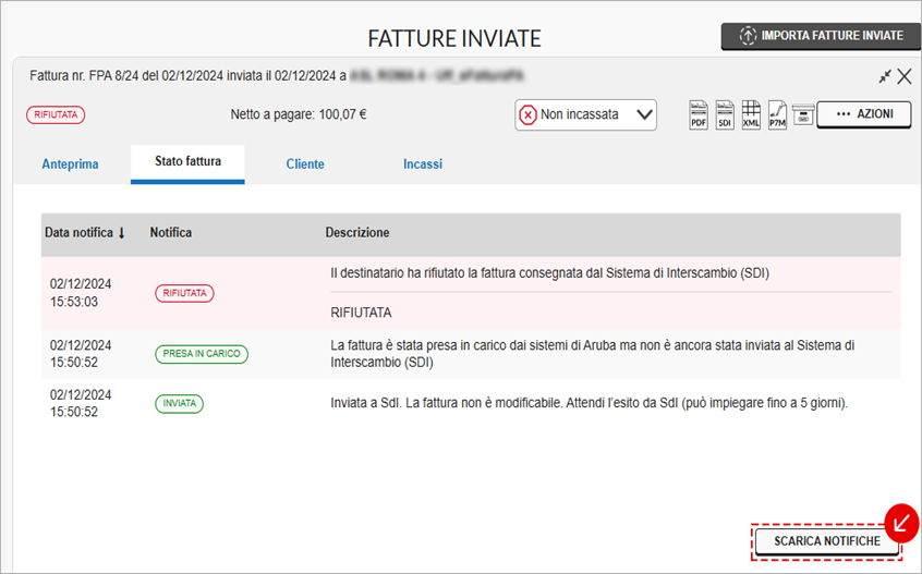 - Scartata: La fattura è stata rifiutata dal Sistema di Interscambio (SdI) che ha restituito un codice di errore specifico.