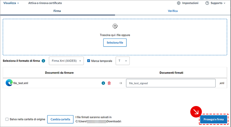 Al termine visualizzi la notifica della corretta firma del file, vai su