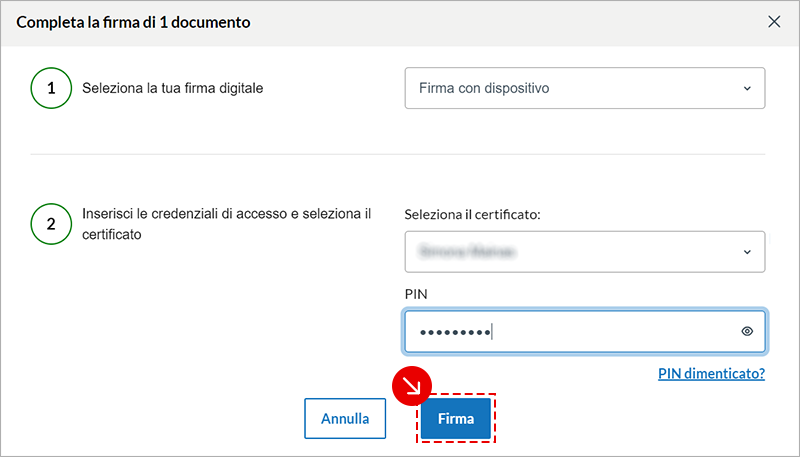 - assicurati che sia selezionato il certificato per la Firma Digitale (in formato cognome - nome);