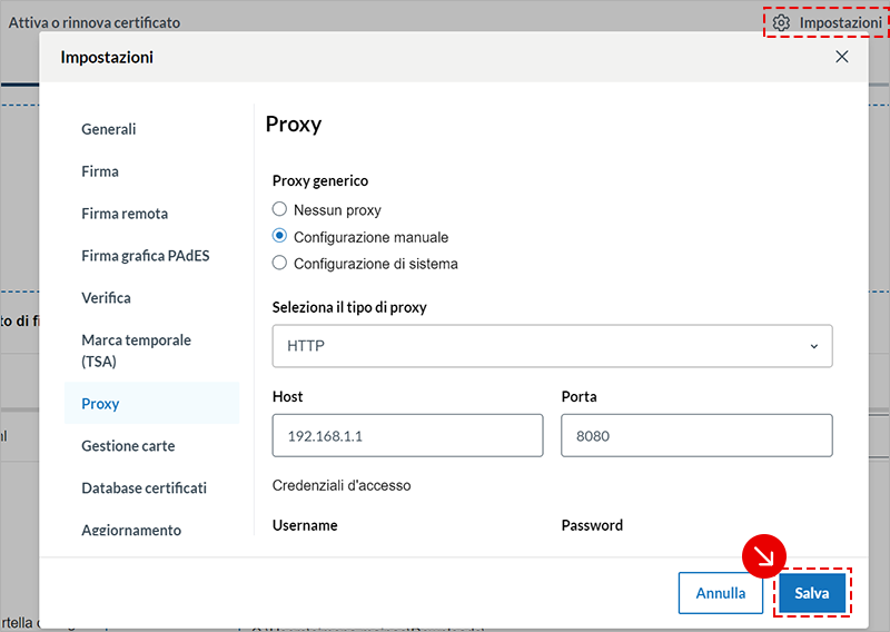 Proxy HTTP, ti permette di svolgere le operazioni di verifica di un file firmato, aggiornamento, controllo, stato di revoca e richiesta di Marche Temporali qualora la postazione si trovi dietro Proxy HTTP.