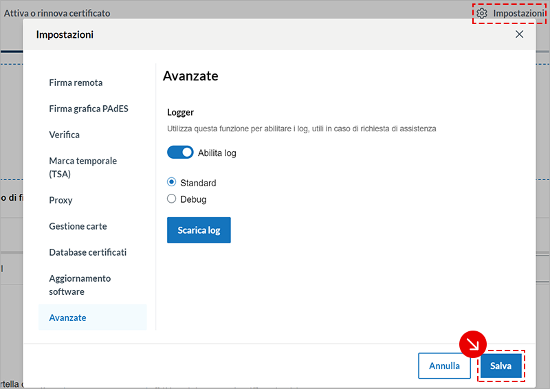 Per generare i log generati in fase di utilizzo di Aruba Sign, ad esempio nel caso in cui si verifichino errori nel completamento delle procedure di firma di un documento, accedi su