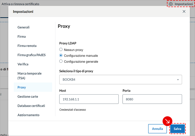 Proxy LDAP imposta parametri e salvali:
