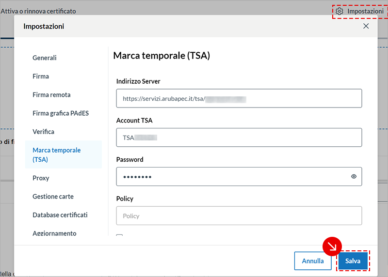 - inserisci l'Account TSA e Password, (se ne hai bisogno, segui la guida su come recuperare lo username e cambiare la password) ricevuti al momento dell'attivazione del servizio di Marcatura Temporale. La voce Indirizzo Server è già automaticamente preimpostata;