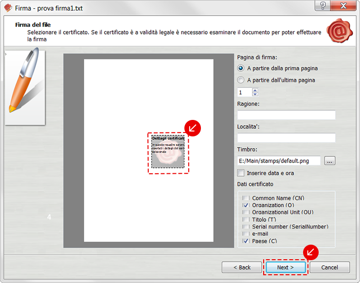 - in caso di firma apposta su più pagine è possibile scegliere su quali apporre la firma;