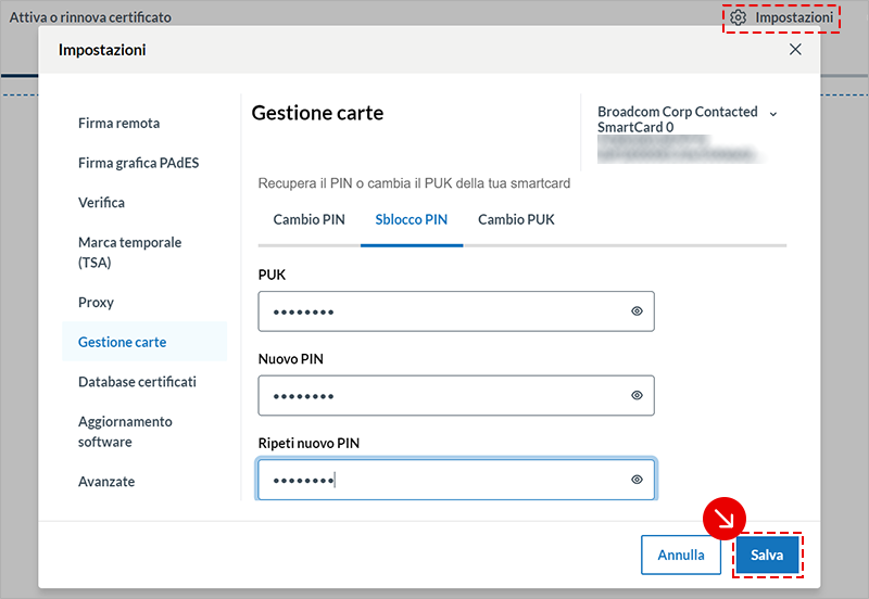 Per impostare il codice PUK è obbligatorio l'utilizzo
