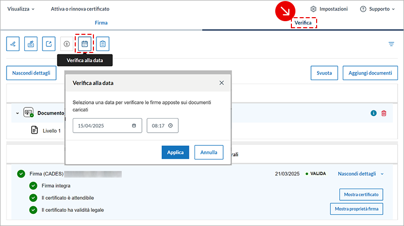 Per verificare la validità di un file in una specifica data, ad esempio nel caso in cui al momento della verifica il certificato con cui è stata apposta la Firma Digitale risulti scaduto, ma la firma sia stata apposta quando era in corso di validità, trascina il file firmato o marcato da verificare sulla sezione