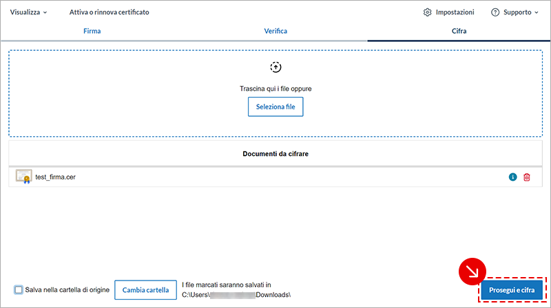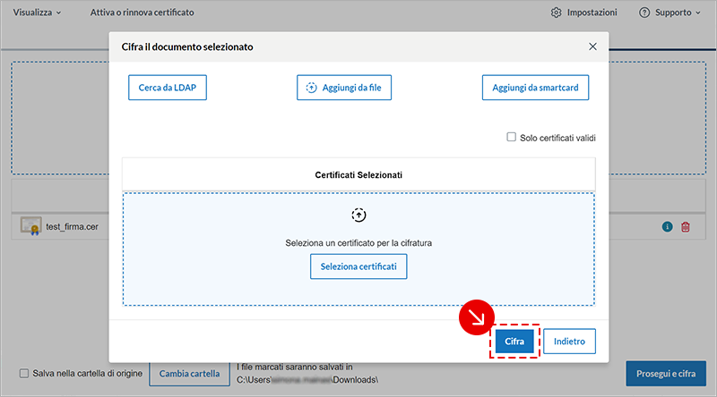 Documenti da cifrare, verifica la correttezza del percorso su cui salvare il file cifrato, o seleziona una nuova cartella vai su