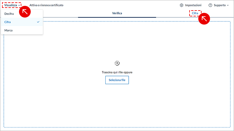 Cifra. A questo punto, sulla destra apparirà una scheda; puoi trascinare o selezionare il file che desideri cifrare: