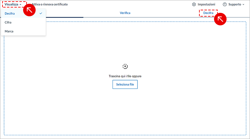 Per decifrare un file, trascina o seleziona il file cifrato (formato