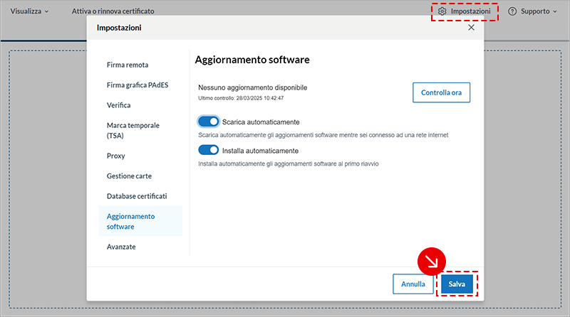Per impostare l'aggiornamento automatico di Aruba Sign, avvia il software e accedi alla sezione